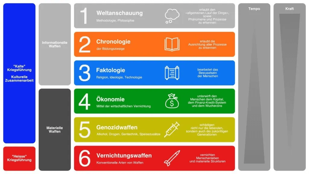 Kerngedanke: Sicherheit entsteht nicht nur durch Armeen, sondern durch kontinuierliche Beeinflussung von Weltanschauung, Information, Wirtschaft, Biologie und Militär.